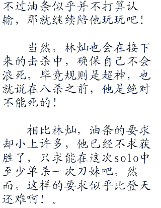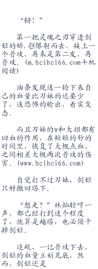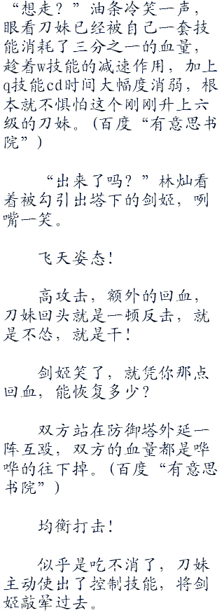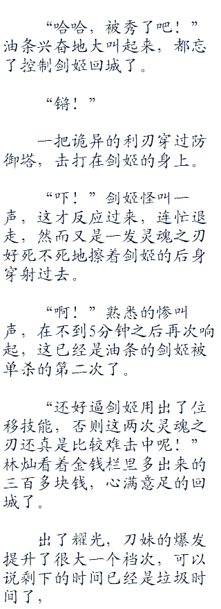 剑姬大惊,慌忙后撤,已经意识到了接下来将要发生的事情,然而技能已经全交的她,根本无力逃脱,虽说自己的血量要比刀妹多上那么一丝,可油条知道接下来会是刀妹时刻。