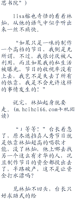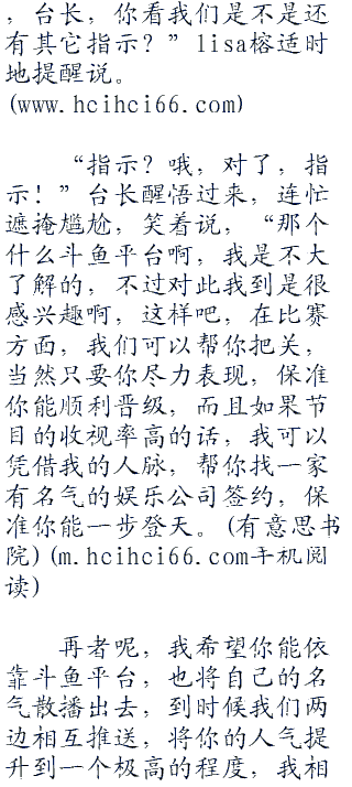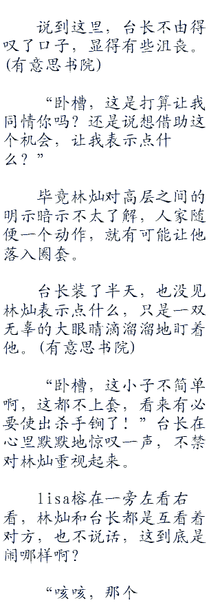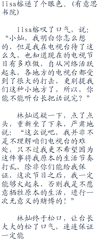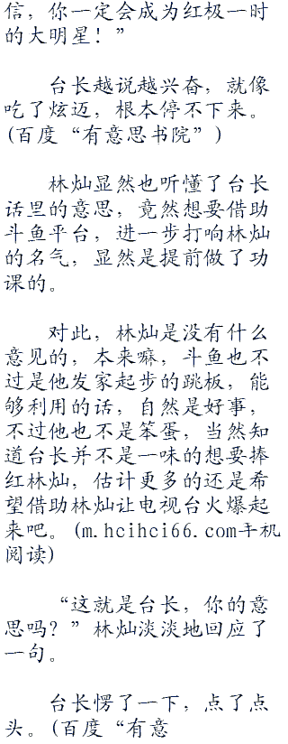 见林灿没回应,lisa榕赶紧帮忙点头,笑着说:“不知道台长对林灿的表现有什么看法呢?”