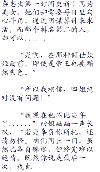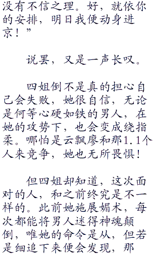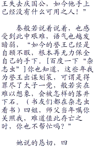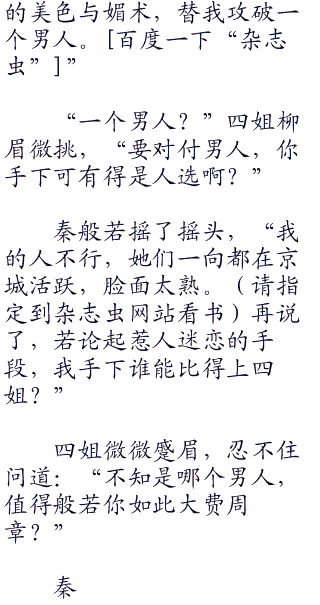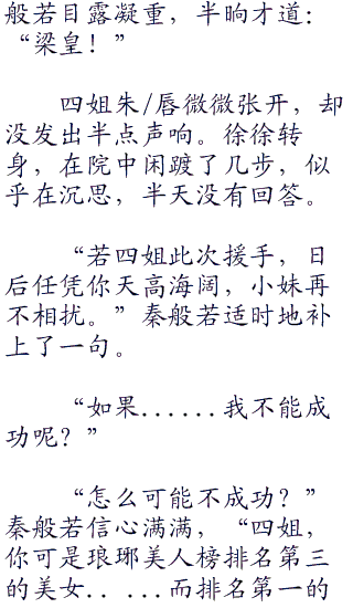 秦般若唇边浮起一丝冷笑,“复国无望也罢,能让大梁同样尝尝亡国的滋味,也算可以告慰师父在天之灵了。四姐,你说了这么多,无外乎是说我不会成功。可我既然“六一三”承了师父衣钵,岂可因为难以成功就放弃?这些年你逍遥度日,我顾念姐妹之情,何曾前来相扰过?若不是遇到了难关,我也不会上门。可是四姐,你辞色滔滔,却一句也不问我为了什么来找你,实在让人心寒!”