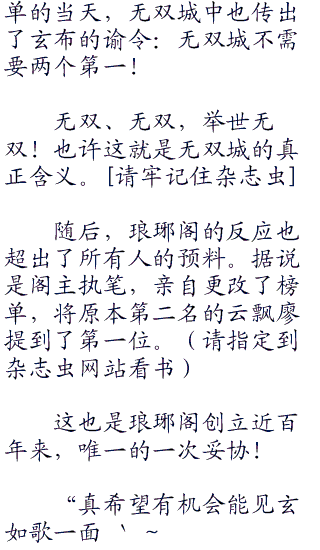据传,当年琅琊阁在制定琅琊美女榜的时候,是将玄如歌排在了第一位,然而这件事却引起了玄布的不满。