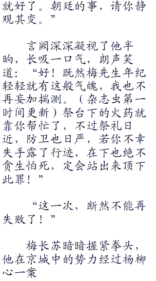 “祭礼还没有开始,皇帝的火纸也没有丢入祭炉,为何不能回头?”梅长苏目光沉稳,面色肃然地道,“祭坛下的火药你就不要管了,我会帮你取出来的!”