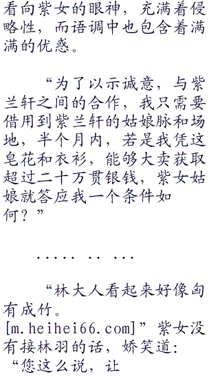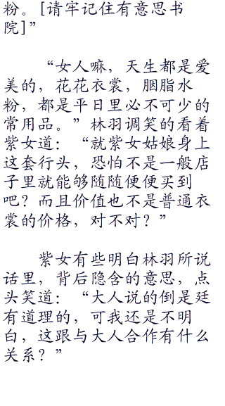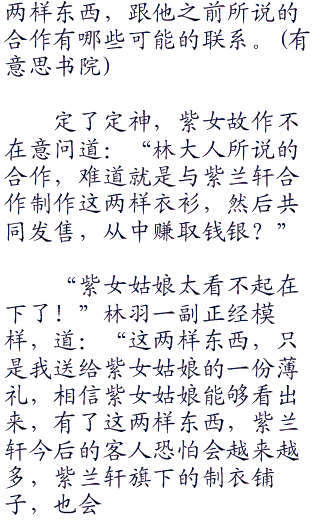 “那咱们就谈谈合作的事情。”林羽陡然抛出这么一句话,让紫女有些跟不上林羽的思维,“其实紫兰轩最多的,就我看来,还是姑娘们的衣衫跟胭脂水