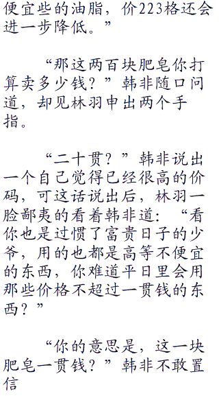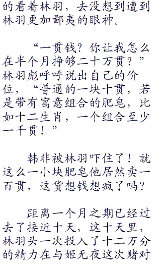 秦般若有些委屈,“本来就是,半个月,二十万贯,就算您那个什么肥皂看起来新奇,又能在这短短几日做出多少来,而且也要能够卖的起价钱啊!”
