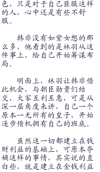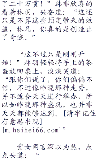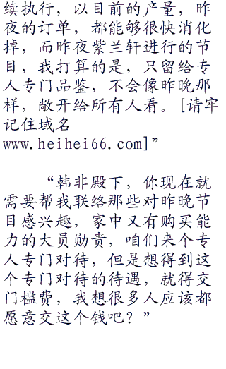 达官贵人们就是喜欢新奇的调调,尤其今晚给他们的视觉冲击力实在是太强悍了,所以这一晚,预定收了多少钱,紫女不知道,但是她光是从预定的数目上看,就已经觉得头脑发昏了。