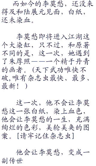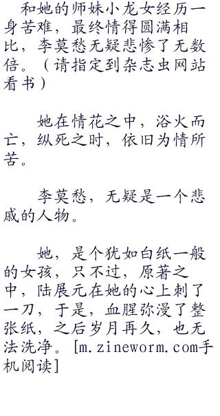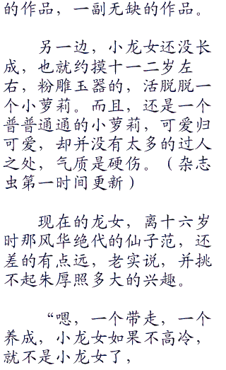 却见谈话的是一大一小两个女孩,大的约摸十七年岁,身穿一身天蓝色的轻衣,肤若白玉,皓腕如雪,皮肤白得不似人间所有,倒像是不食人间烟火的仙子。然而,她的脸上,却带着犹如邻家小女孩一般的兴奋笑容。
