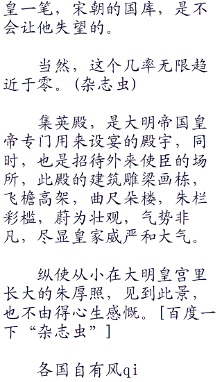 是以,杨家七郎在宫墙外,便和朱厚27照分开。而朱厚照一行人,也在将兵器交给皇宫的大内侍卫之后,跟着公公前往集英殿。
