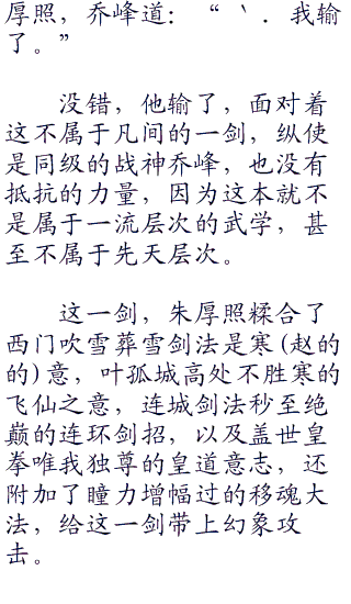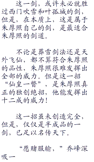 “朱兄弟,你果然是绝世的天才,”乔峰由衷地感叹道,“若早上三年,同级一战,我绝非你的对手。”