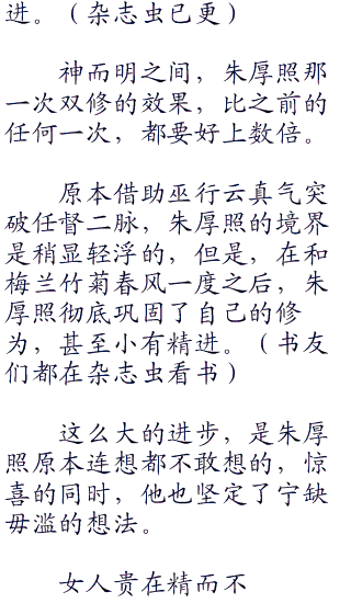 御女心经,心理上的满足感,十分重要,甚至可以左右双修效果。在极大的心里满足感下,朱厚照感觉自己的灵魂都在升华,晋升到了天人合一的境界,修为飞速精