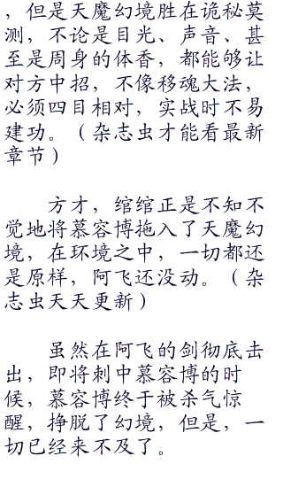 天魔幻境,从某个方面来说,甚至比移魂**还要高深,因为天魔幻境04乃是营造出一个幻境,叫人不知不觉就中招,在战斗中,就能让人受到极大的影响。