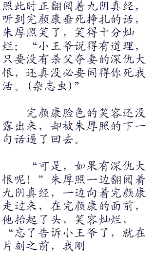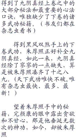 眼中红光一现,朱厚照露出一丝笑容,从陈玄风的袖子里掏出一本薄薄的秘籍,秘籍的封面处,是一行娟秀的大字“九阴真经(下卷)”,看字迹应该是女子所写。