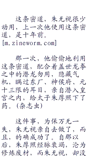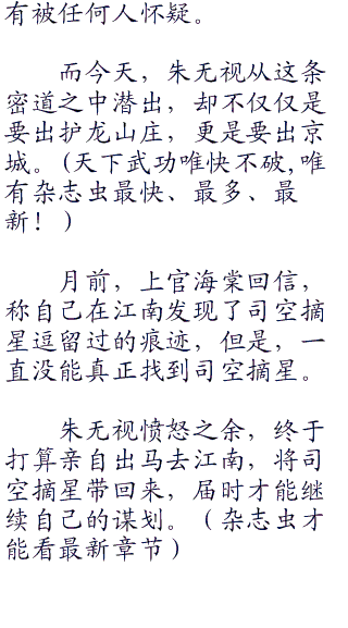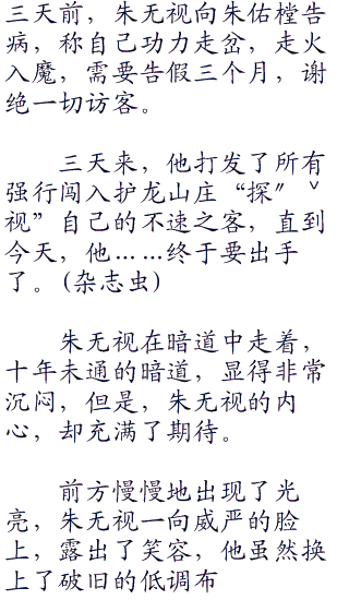 而朱无视的秘密练功房里,还有更隐秘的机关,可以开启一条密道,直接通往护龙山庄七里之外的小树林中。