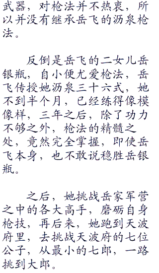 民间传说,自然有夸张之处,不过,岳飞以沥泉枪成名却是不假。而岳飞自创的沥泉枪三十六式,更是大宋帝**营之中最精妙的冲锋陷阵武学之一。