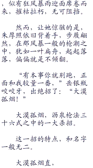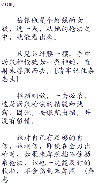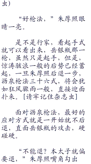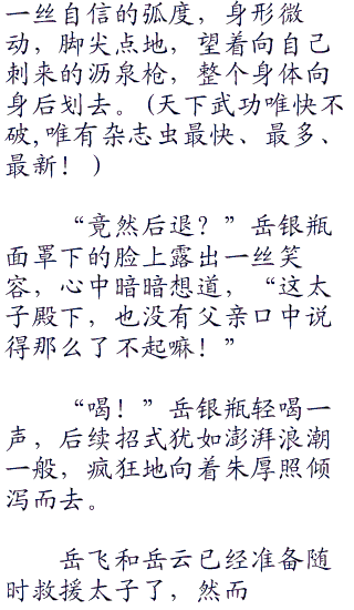 这一打恰恰打在蛇头上,那蛇眼露出金光,张开血盆般大口,望着岳飞扑面撞来。岳飞连忙把身子一侧,让过蛇头,趁着势将蛇尾一拖。一声响亮,定睛再看时,那蛇却化作了一条丈八长的沥泉神枪,回头看那泉水已经干涸,再无一滴。