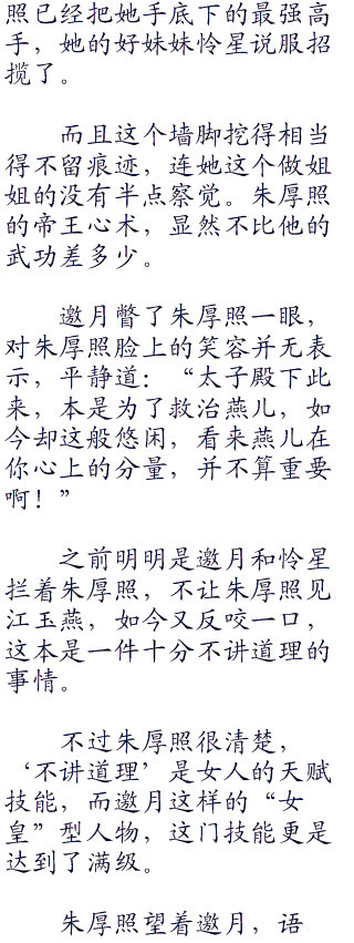 邀月哼道:“既然知道,你还敢挑衅本宫主?莫非你以为,明皇太子的身份,就能让本宫主不敢动你吗?”