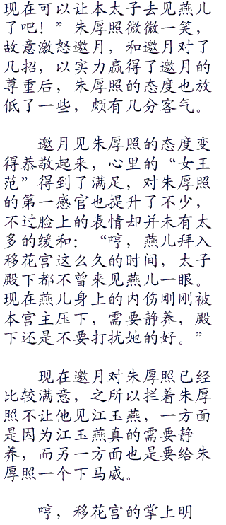 朱厚照不是段正淳,不会玩了一个女人之后就丢到一边不管,他虽然风流,不过,他会负起自己的责任,他对每一个自己的女人,都会尽自己所能去保护。