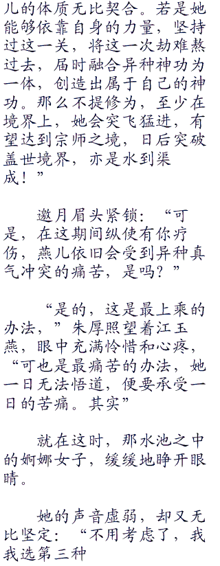 江玉燕的身体此时已经非常虚弱,如果莽撞地只吸收其中任何一种真气,另一股真气必然趁势反击,到时候江玉燕再受冲击,连命都不一定保得住。