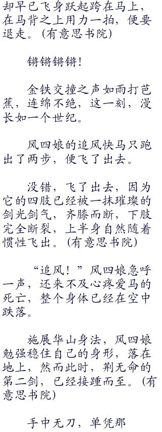 风四娘实在没有把握继续留下来了,她必须尽快逃跑,否则,几乎十死无生。