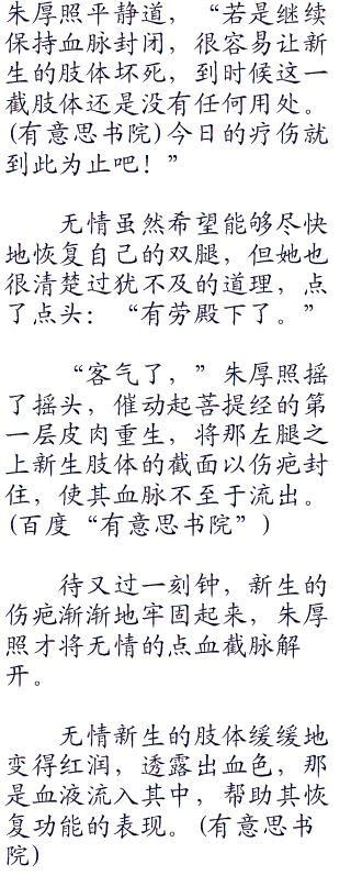渐渐地,无情左腿膝盖之下长出一小截新生的肢体,约莫有整条小腿十分之一的长度。(因为同时修复两条腿需要分心二用,效率不会增加,无情受到的痛苦反而会更强,所以是先重生左腿,再重生右腿。)