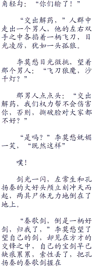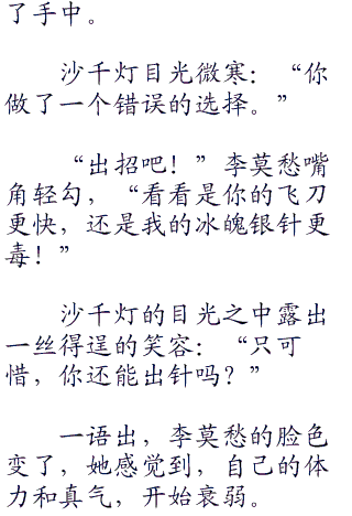 飞刀狼魔沙千灯,蛰伏在那一群权力帮众之中,犹如野狼一般隐而不发,为的就是让李莫愁失去警惕,好在必要的时候一击必中。