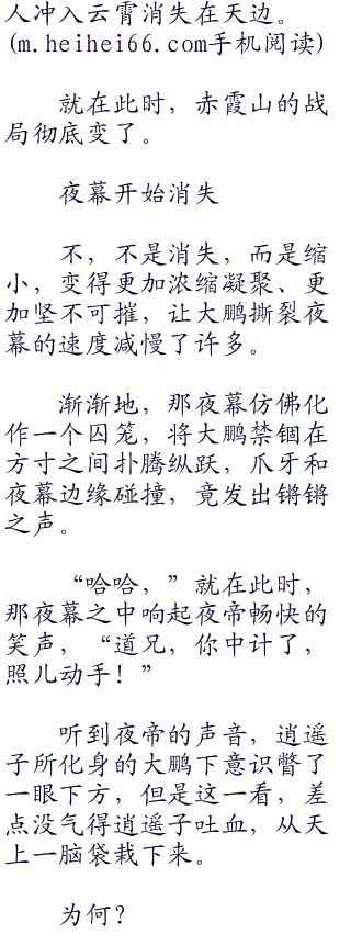 阴阳逆转,乾坤翻覆,大鹏双翼犹如两柄无比锋锐的神刀,切割过的地方,夜幕犹如一张黑纸般裂开,透出丝丝光亮,然后又很快地恢复原样,星光闪闪,妖异而鬼魅。