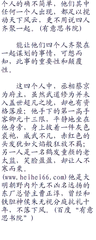 大明帝国明面上的五大盖世高手中,号称“十三限”的元限,正是蔡京手下的第一高手客卿。有元十三限相帮,无论是权势还是武力,蔡京都非同小可,即使是明皇朱佑樘在面对蔡京的言论之时,也给他留三分面子,以维系朝堂之平衡。