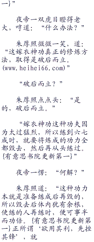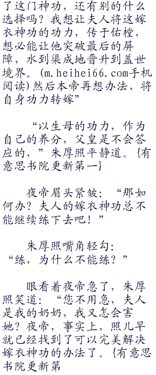 “但嫁衣神功同时也一门‘为他人作嫁衣裳’的武功,”夜帝轻轻一叹,“任何人修炼嫁衣神功,虽然能在短时间内武功大进,而且真气如火极富侵蚀性。但这种真气不但会侵蚀他人,同样也会侵蚀自己,功力越高,对自己身体造成的痛苦也就越强烈,”夜帝眼中闪过一丝痛苦之色,“夫人修炼嫁衣神功数十载,想必在这门神功上的造诣已然匪浅,现在要废除,谈何容易?”