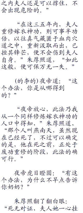 朱厚照微微一笑:“如今夜帝您回来了,一切自然不成问题,夫人的嫁衣神功,自然也有法可以解决了。”