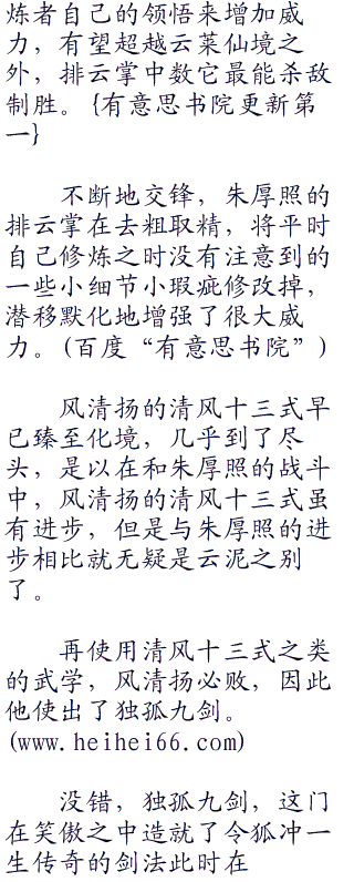 排云掌法第十一式“云莱仙境”以掌中云气,布置诡秘幻境,使敌人置身于云气中摸不着边际。