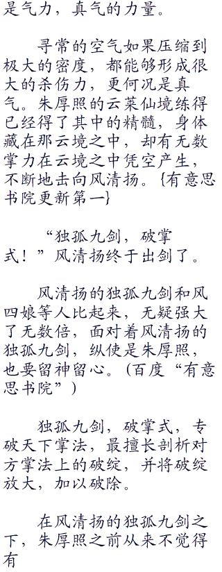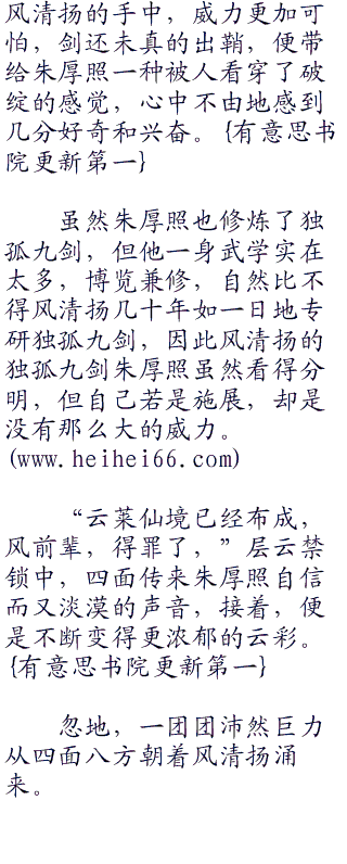 如果说原来的风清扬施展清风剑法,清风徐来,水波不兴,犹如一个隐居山林的仙翁,那么此刻,他俨然已经回归自己的本色,成为了一个锋芒毕露的剑客。而且,以他的剑意,纵使是朱厚照也不敢稍作轻视。