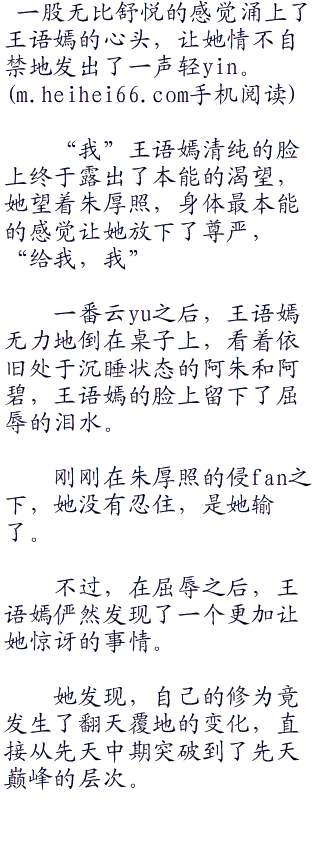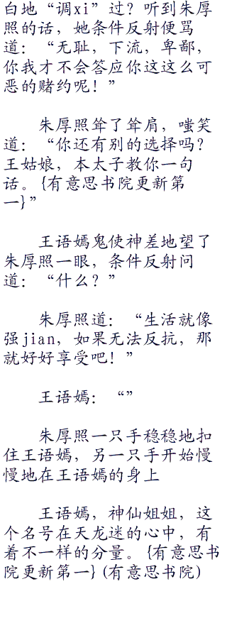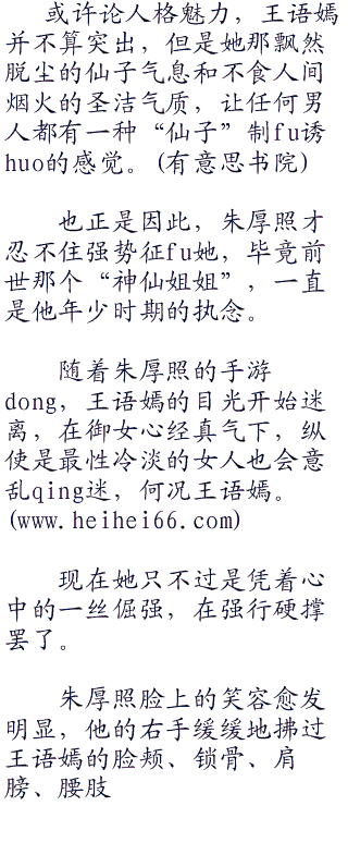 只不过,和李秋水的“魅se入骨”相比,王语嫣身上带着一分不谙世事的天真烂漫和清雅高洁,而这种“圣洁”的气质,往往更能让男人对她产生征服欲。这也是朱厚照并没有采取最方便最简单的办法,直接把王语嫣修改记忆的原因。
