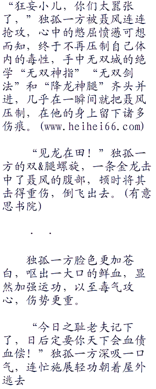 聂风的眼中露出一丝不忍,不过还是点点头,深吸一口气,攻击向独孤一方,风神腿法凌厉如刀,每一腿都逼得中毒的独孤一方不得不退。