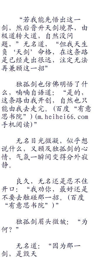 “因为那是一招代表着毁灭的剑,它的存在为的就是毁灭一切。而天剑的存在,为的是守护一切,这二者本就是矛盾的正邪两面,无法融洽。”无名轻轻一叹,“那一剑,代表着‘天剑大道’之外的另一条路,或许可以称为剑的一条‘极道’,在境界上或许比不得天剑高远,但是论杀伤力,纵使是天剑也要相形见绌。”