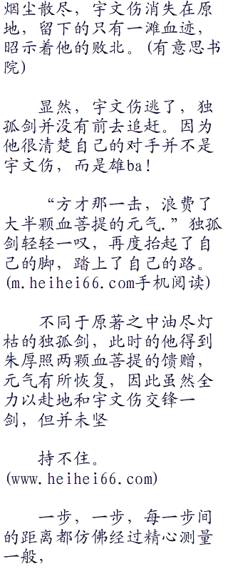 此时,宇文伤的脑海中,再也没剩下“切磋考较”独孤剑的想法,他只有一个念头,逃,逃得越远越好,不然恐有性命之忧。ww.w.hei.c.obr />