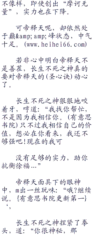 长生不死之神嘴角抽搐,心里咆哮,帝释天是故意的,绝对是故意的,明知道他最烦恼的就是只能长生不能不老,故意炫耀自己的长生不老!