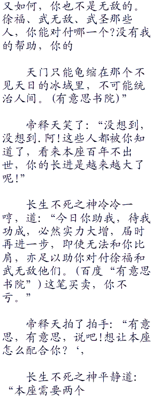 帝释天嘿嘿一笑:“既然不相信本座,你又为何要唤醒本座?那好,本座继续回我的安乐窝去睡大觉,反正本座不死不灭,管他大争之世血流成