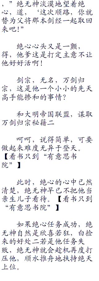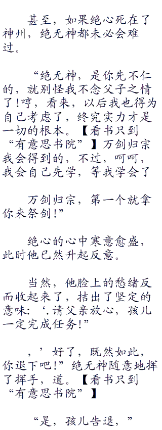 “孩儿二”绝心望着绝无神,良久,他深吸一口气,道,“孩儿明白了!一定完成父亲交给孩儿的人物,绝对不让父亲失望!”