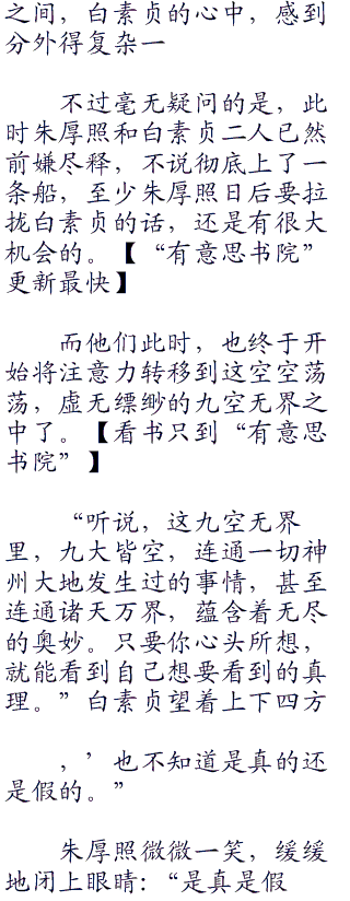 九空无界超越时间和空间界限,在九空无界中,时间的流速和外界截然不同。有意!思书院或许在九空无界之中度过了十年,外界只过去了一瞬间,又或许在九空无界之中只度过了一瞬间,外界已