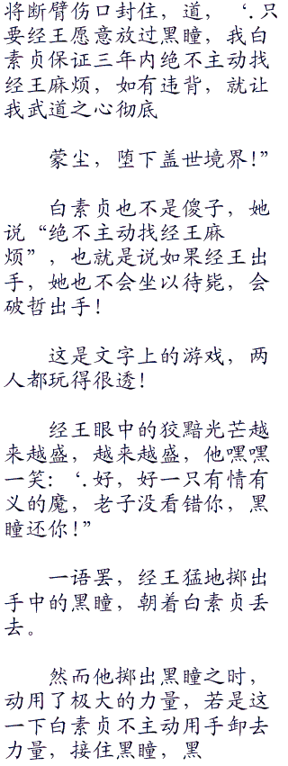 白素贞眼里闪烁着冷厉的光芒,她死死地盯着经王,哼道:“你不自裁,本座保证待会你会比自裁更痛苦一百倍!”