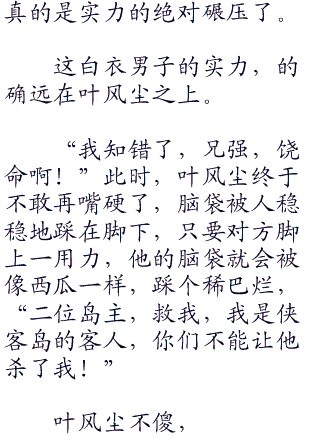 白衣男子望着被自己死死地按着脑袋,动弹不得的叶风尘,冷冷哼道:“这么弱,你这几百年的时间白活的吗?”