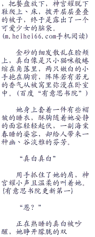 带上围裙开始做今天给真白准备的饭菜,神宫耀愈发的觉得自己有当保姆的潜质,不过如果照顾的对象是真白这种既可以帮忙工作,又可以暖床的萌妹子的话,他到是一点都不介意。