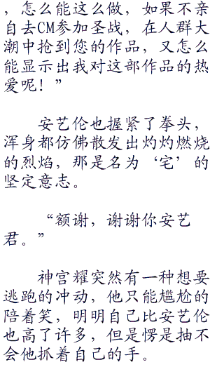被抓住了衣服的神宫耀愣住了神,见过他本人的人并不多,神宫耀也没再网上发布过自己的照片,虽然他自己也知道,总有一天他会彻底的走进人们的视线中,被所有人熟知是必然而然的结果,但是现在他更喜欢这种略有些神秘的,被人猜测他真实样貌的感觉。