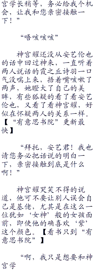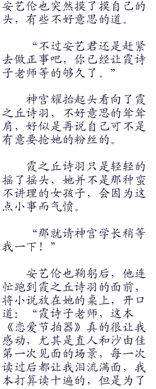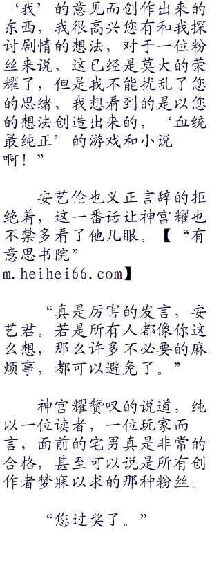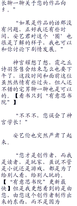 安艺伦也兴奋而滔滔不绝的讲着,好似是见到了创作者神宫耀后,想要将自己酝酿了许久的感情都发泄出来。