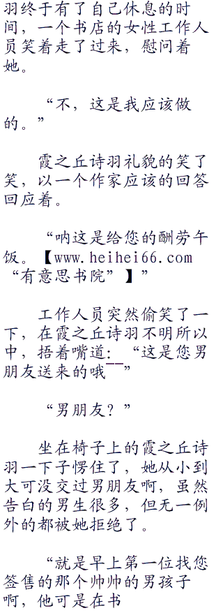 “咦咦?你是二年级的霞之丘诗羽学姐啊!!什么嘛,‘霞诗子’这个笔名和霞之丘诗羽也太像了吧,何必这么多此一举,还不如像神宫老师那样直接用本名呢!”