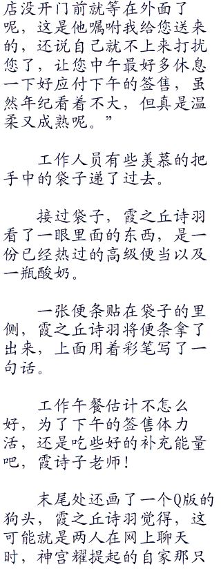 这么说着的霞之丘诗羽还抬起头看了一眼神宫耀。安艺伦也这个人如果说到自己喜欢的地方,会根本不顾及其他人的感受旁若无人的大说特说,神宫耀觉得他到是最适合做推销员