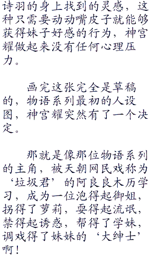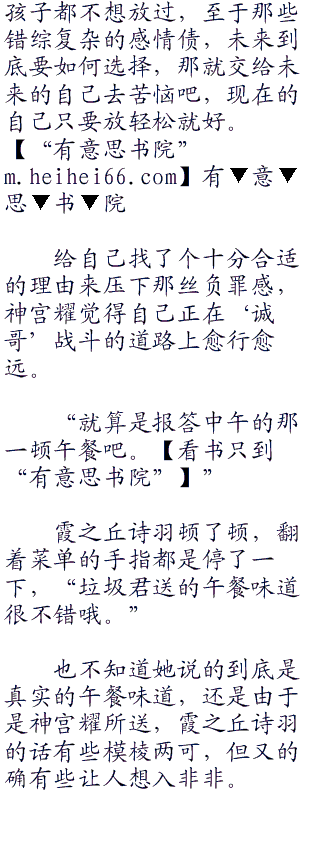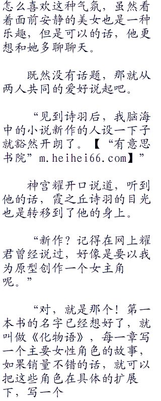 就这样把真白一个人扔在家里,自己却在外面和其他女人浪真的好么?神宫耀的心里纠结起来,就像是那些轻小说中的男主角一样,突然有些想要逃避,犹豫的无法下决定,说实话,相比于刚刚第一次现实见面的霞之丘诗羽,他其实更在乎那个几乎一天到晚都陪着他,又在自己事业上带给自己极大帮助的真白。