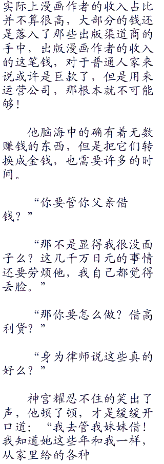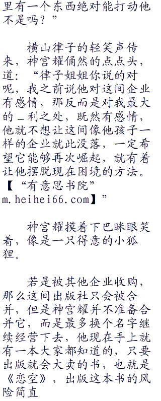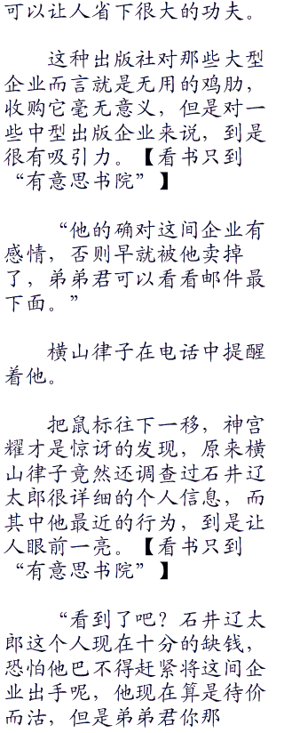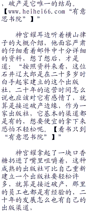 “恩,是一间成立了二十年的出版社,社长是石井辽太郎,算是个人独资企业,总部设立在东京都丰岛区,十多年前在社长石井辽太郎的带领下曾经辉煌过一段时间,不过八年前这位社长的决策失误,让整个出版社都是开始走上了下坡路,如今这个企业苟延残喘,可以说是接近破产边缘,若不被人收购或者有新的资金注入