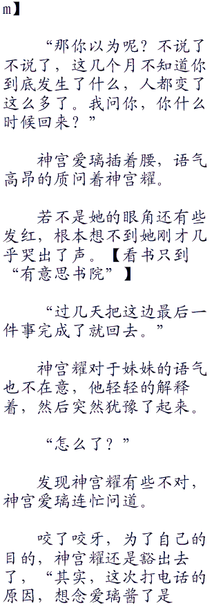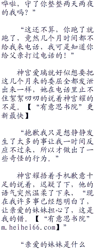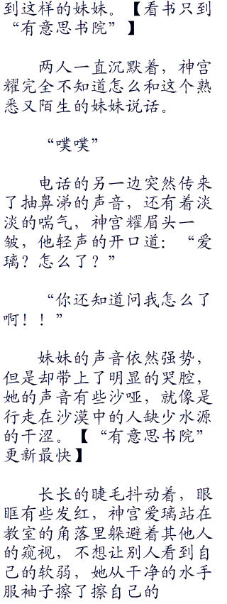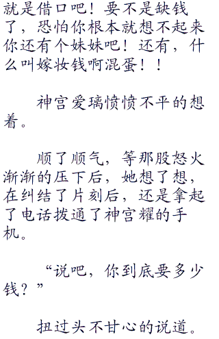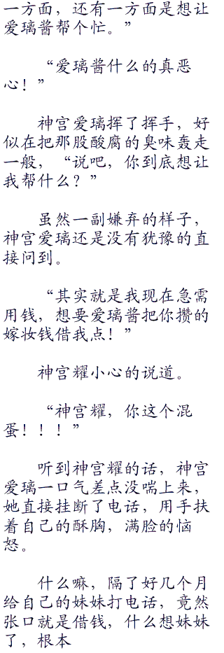 电话另一边的神宫耀也是吓了一大跳,这跟传说中温柔的妹妹完全不符啊?想象中那种柔软怯懦的妹妹形象一下子烟消云散,而一个驕傲的像是女王一样的妹妹形象,渐渐的出现在脑海中。