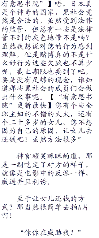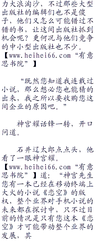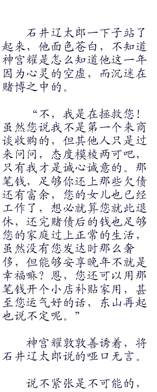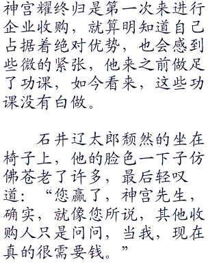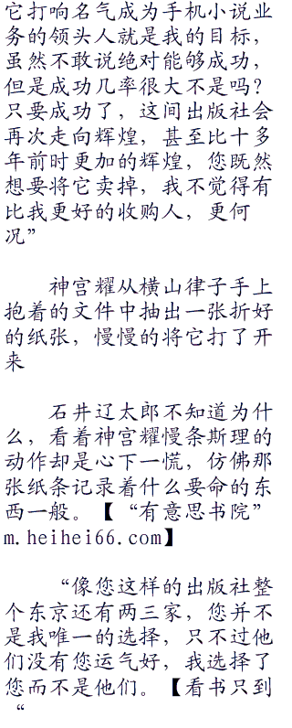 “神宫先生,账不是这么算的,我们企业不是什么大型企业,员工也只有二十七名,对于一个不大的出版社来说,这些人也勉强够用,一月需要支付的薪水算上保险开支也只要一千多万日元,但是抛去这一千多万日元,抛去一年的写字楼租金,您支付我的这笔钱也和我们企业的现时实际价值不符,您要知道,对于一间发展成熟的出版社,我们与许多关联企业有着良好的合作关系与合同,有着自己的出版渠道,有属于自己的文库”