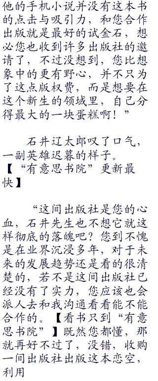 石井辽太郎仿若找到了激情,他侃侃而谈,只是在说到文库时顿了顿,才是无奈道:“好吧,我们文库所拥有的版权书籍已经有些过时了,并不能换来财富,但是文库的建立以及管理这点还是做的很好的。w.ww..c.om除去这些,我们在东京繁华地段还有着一间直属的书店,要知道”