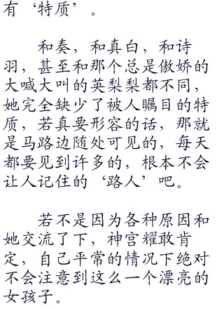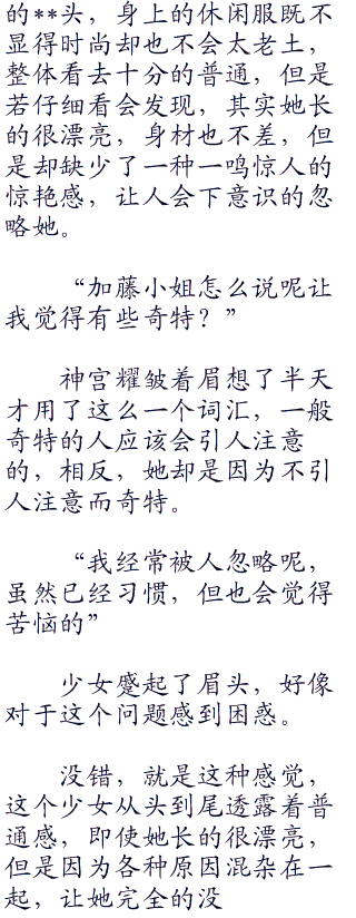 正在低头看资料的神宫耀无意中一扫,看到拿着纸杯的手指白嫩纤细,和北川那有些胖的手完全不同,诧异的他抬起头来,发现来人竟然是一个陌生少女。